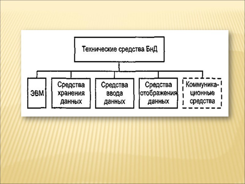 Компоненты банка данных Технические средства: компьютеры, устройства ввода и отображения выводимой информации; Организационно-методические средства: инструкции, методические и регламентирующие документы, предназначенные для различных пользователей, имеющих доступ к информации. Администратор банка данных: группа специалистов, обеспечивающих создание, функционирование и развитие банка данных.