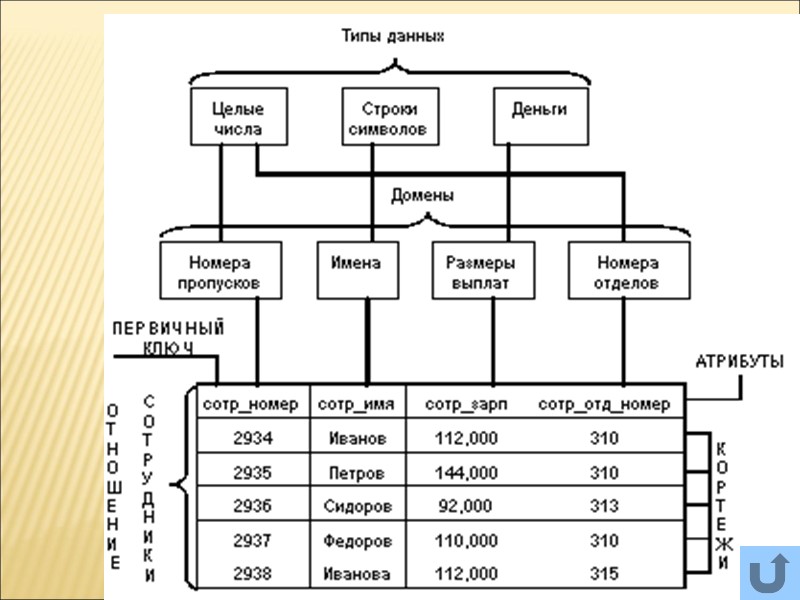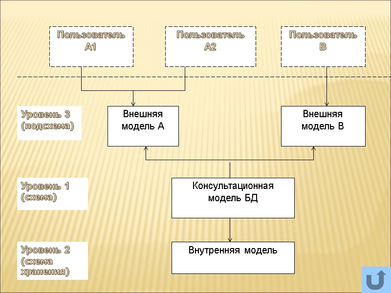 Уровни представления данных: Логический (даталогический) – уровень математической модели, условное представление данных как системы объектов и связей между ними; | программно-аппаратные средства СУБД Физический (внутренний) – уровень программно-аппаратной реализации хранения данных; Внешний (концептульный) – визуальное представление данных, с которым работает конечный пользователь | языки управления базами данных (SQL) иллюстр.