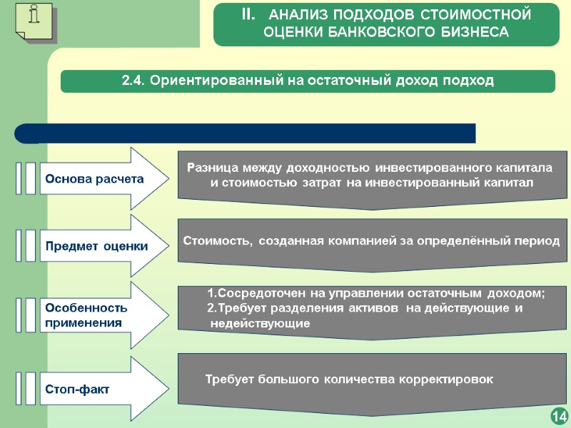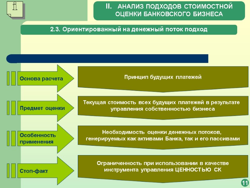 2.2. Ориентированный на активы подход 10 2.2.3. Условия применимости подхода, ориентированного на активы Для банковского бизнеса методы оценки стоимости чистых активов могут быть применимы использоваться при необходимости оценки отдельных финансовых инвестиций в качестве дополнительного (неосновного) способа оценки бизнеса II. АНАЛИЗ ПОДХОДОВ СТОИМОСТНОЙ ОЦЕНКИ БАНКОВСКОГО БИЗНЕСА