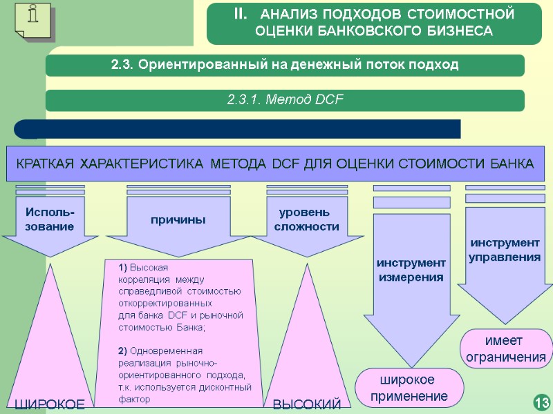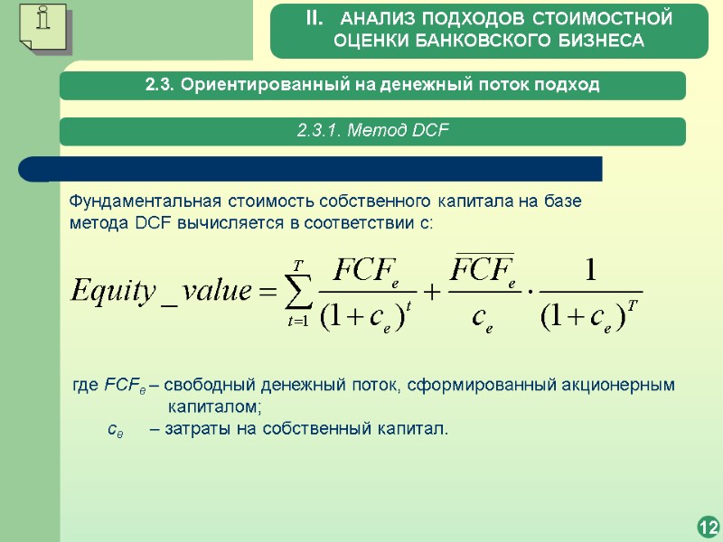 2.3. Ориентированный на денежный поток подход 12 2.3.1. Метод DCF Фундаментальная стоимость собственного капитала на базе метода DCF вычисляется в соответствии с: где FCFe – свободный денежный поток, сформированный акционерным капиталом; сe – затраты на собственный капитал. II. АНАЛИЗ ПОДХОДОВ СТОИМОСТНОЙ ОЦЕНКИ БАНКОВСКОГО БИЗНЕСА