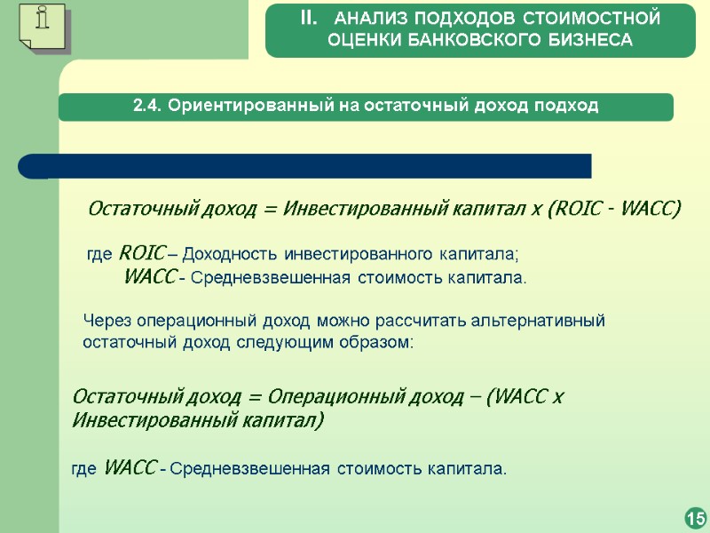 2.4. Ориентированный на остаточный доход подход 15 Остаточный доход = Инвестированный капитал x (ROIC - WACC) где ROIC – Доходность инвестированного капитала; WACC - Средневзвешенная стоимость капитала. Через операционный доход можно рассчитать альтернативный остаточный доход следующим образом: Остаточный доход = Операционный доход – (WACC x Инвестированный капитал) где WACC - Средневзвешенная стоимость капитала. II. АНАЛИЗ ПОДХОДОВ СТОИМОСТНОЙ ОЦЕНКИ БАНКОВСКОГО БИЗНЕСА