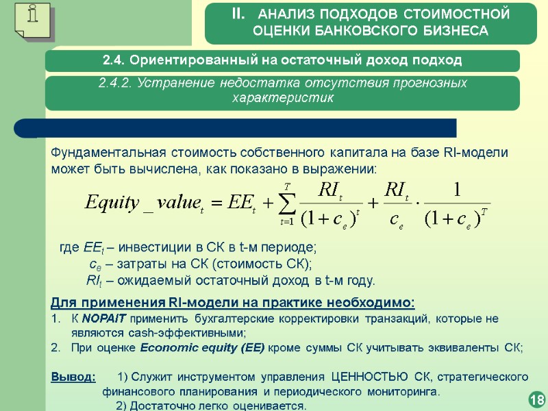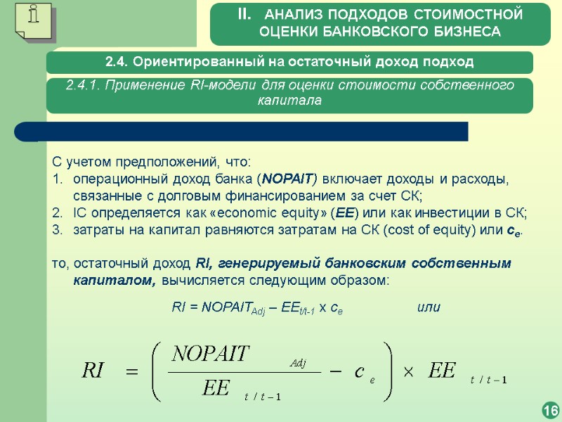 2.4. Ориентированный на остаточный доход подход 16 2.4.1. Применение RI-модели для оценки стоимости собственного капитала С учетом предположений, что: операционный доход банка (NOPAIT) включает доходы и расходы, связанные с долговым финансированием за счет СК; IC определяется как «economic equity» (EE) или как инвестиции в СК; затраты на капитал равняются затратам на СК (cost of equity) или ce. то, остаточный доход RI, генерируемый банковским собственным капиталом, вычисляется следующим образом: RI = NOPAITAdj – EEt/t-1 х ce или II. АНАЛИЗ ПОДХОДОВ СТОИМОСТНОЙ ОЦЕНКИ БАНКОВСКОГО БИЗНЕСА