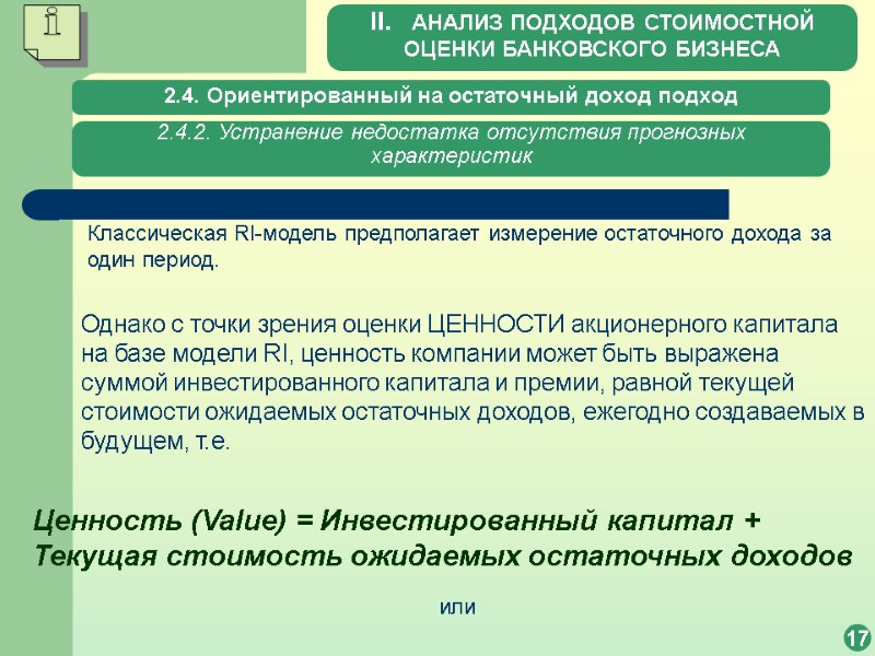 2.4. Ориентированный на остаточный доход подход 17 2.4.2. Устранение недостатка отсутствия прогнозных характеристик Классическая RI-модель предполагает измерение остаточного дохода за один период. Однако с точки зрения оценки ЦЕННОСТИ акционерного капитала на базе модели RI, ценность компании может быть выражена суммой инвестированного капитала и премии, равной текущей стоимости ожидаемых остаточных доходов, ежегодно создаваемых в будущем, т.е. Ценность (Value) = Инвестированный капитал + Текущая стоимость ожидаемых остаточных доходов или II. АНАЛИЗ ПОДХОДОВ СТОИМОСТНОЙ ОЦЕНКИ БАНКОВСКОГО БИЗНЕСА