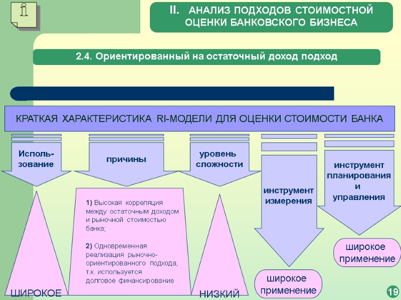 2.4. Ориентированный на остаточный доход подход 18 2.4.2. Устранение недостатка отсутствия прогнозных характеристик Фундаментальная стоимость собственного капитала на базе RI-модели может быть вычислена, как показано в выражении: где EEt – инвестиции в СК в t-м периоде; сe – затраты на СК (стоимость СК); RIt – ожидаемый остаточный доход в t-м году. Для применения RI-модели на практике необходимо: К NOPAIT применить бухгалтерские корректировки транзакций, которые не являются cash-эффективными; При оценке Economic equity (EE) кроме суммы СК учитывать эквиваленты СК; Вывод: 1) Служит инструментом управления ЦЕННОСТЬЮ СК, стратегического финансового планирования и периодического мониторинга. 2) Достаточно легко оценивается. II. АНАЛИЗ ПОДХОДОВ СТОИМОСТНОЙ ОЦЕНКИ БАНКОВСКОГО БИЗНЕСА