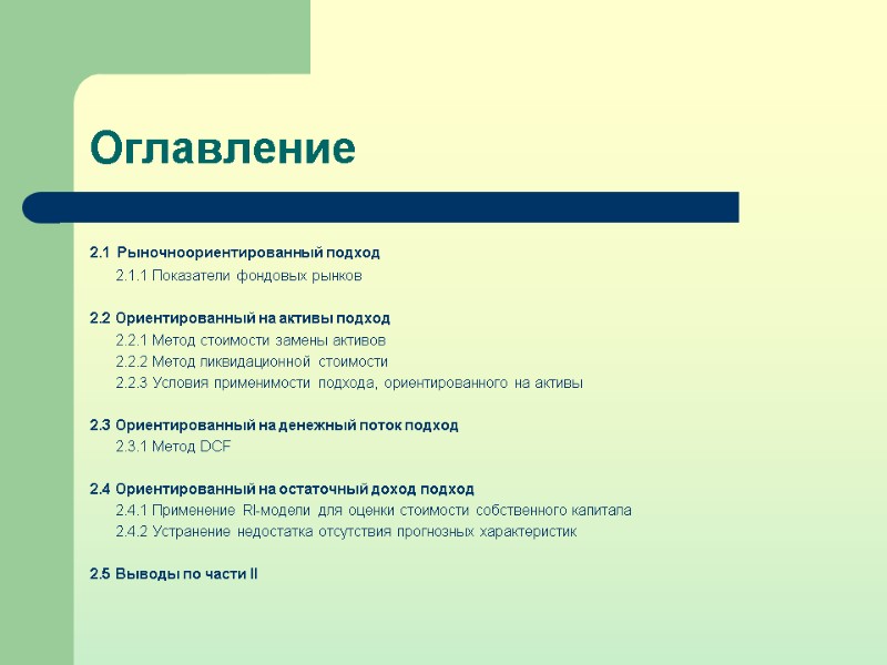 Оглавление 2.1 Рыночноориентированный подход 2.1.1 Показатели фондовых рынков 2.2 Ориентированный на активы подход 2.2.1 Метод стоимости замены активов 2.2.2 Метод ликвидационной стоимости 2.2.3 Условия применимости подхода, ориентированного на активы 2.3 Ориентированный на денежный поток подход 2.3.1 Метод DCF 2.4 Ориентированный на остаточный доход подход 2.4.1 Применение RI-модели для оценки стоимости собственного капитала 2.4.2 Устранение недостатка отсутствия прогнозных характеристик 2.5 Выводы по части II