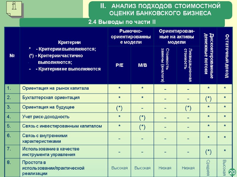 19 КРАТКАЯ ХАРАКТЕРИСТИКА RI-МОДЕЛИ ДЛЯ ОЦЕНКИ СТОИМОСТИ БАНКА ШИРОКОЕ Исполь- зование причины уровень сложности 1) Высокая корреляция между остаточным доходом и рыночной стоимостью банка; 2) Одновременная реализация рыночно- ориентированного подхода, т.к. используется долговое финансирование НИЗКИЙ инструмент измерения инструмент планирования и управления широкое применение широкое применение 2.4. Ориентированный на остаточный доход подход II. АНАЛИЗ ПОДХОДОВ СТОИМОСТНОЙ ОЦЕНКИ БАНКОВСКОГО БИЗНЕСА