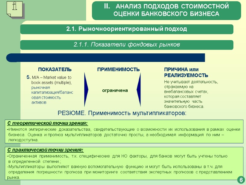 2.1. Рыночноориентированный подход 2.1.1. Показатели фондовых рынков ПОКАЗАТЕЛЬ ПРИМЕНИМОСТЬ ПРИЧИНА или РЕАЛИЗУЕМОСТЬ 5. M/A – Market value to book assets (multiple), рыночная капитализация/балансовая стоимость активов ограничена Не учитывает деятельность, отражаемую на внебалансовых счетах, которая составляет значительную часть банковского бизнеса. РЕЗЮМЕ. Применимость мультипликаторов: С теоретической точки зрения: -Имеются эмпирические доказательства, свидетельствующие о возможности их использования в рамках оценки бизнеса. Оценка и прогноз мультипликаторов достаточно просты, а необходимая информация по ним – легкодоступна. С практической точки зрения: -Ограниченная применимость, т.к. специфические для НО факторы, для банков могут быть учтены только в определенной степени.; Мультипликаторы выполняют важную вспомогательную функцию и могут быть использованы в т.ч. для определения погрешности прогноза при мониторинге соответствия экспертных прогнозов с представлением рынка. 6 II. АНАЛИЗ ПОДХОДОВ СТОИМОСТНОЙ ОЦЕНКИ БАНКОВСКОГО БИЗНЕСА