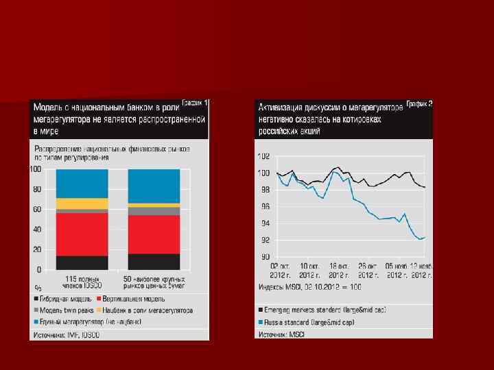 Институциональные модели регуляторов Модель секторального (специализированного) надзора • Регулирование и надзор за каждым сектором (банки, фондовые посредники и страховщики) закрепляются за отдельными органами регулирования Модель двойного пика (“twin peaks” model) • Регулирование и надзор закрепляются за двумя органами регулирования (как правило, центральным банком и управлением пруденциального надзора) Модель интегрированного регулирования и надзора (мегарегулирование) Регулирование и надзор за всеми типами финансовых посредников выделяются в один орган, который отвечает как за пруденциальный надзор, так и за защиту прав инвесторов и потребителей финансовых услуг