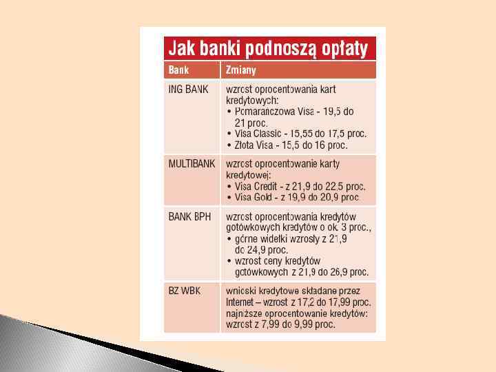 Bankowość przedsiębiorstw Bankowość micro i małych firm Klienci osoby fizyczne prowadzące dz. Gospodarczą, małe firmy 550 prac. Klienci Sieć placówek Produkty standardowe, zebrane w pakiety Produkty Sieć placówek Bankowość dużych firm średnie firmy, pow 50 pracowników zindywidualizow ane w ramach jednej oferty Klienci Bankowość średnich firm Produkty firmy z pierwszej „ 500” przedsiębiorstw indywidualne, specjalnie tworzone dla 1 klienta rozbudowana, oddzielne pomieszczenia do obsługi specjalne oddziały lub wydzielone pomieszczenia w oddziałach Sieć placówek brak - obsługa przez Centralę lub oddziały regionalne Obsługa indywidualna, bezpośrednia, personalna, pośrednia Obsługa indywidualna, bezpośrednia, personalna, Obsługa indywidualna, bezpośrednia, „u klienta”