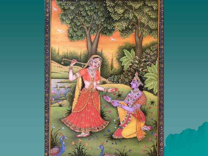 Махабхарата u u Бхагавад-гита: книга Махабхараты религиознофилософское наставление в виде беседы царя Арджуны и его возницы Кришны важнейший текст для более поздних направлений индуизма: вишнуизма и кришнаизма Аватара «нисхождение» божества в земной человеческий мир. Божество принимает облик, доступный для восприятия человека u Кришна - одна из десяти аватар Вишну u