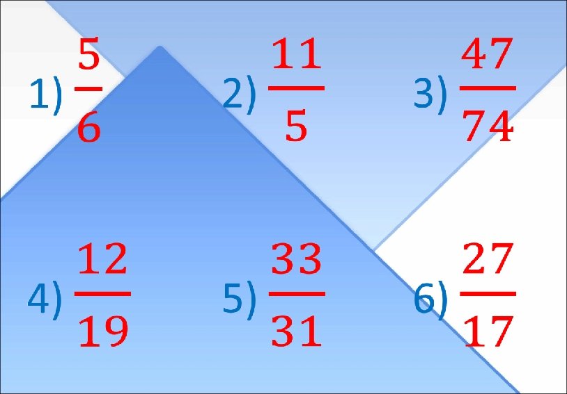 1. Вставьте пропущенные слова так, чтобы получилось верное высказывание. А) Чтобы сложить дроби с одинаковыми знаменателями, нужно сложить их ЧИСЛИТЕЛИ , а ЗНАМЕНАТЕЛИ оставить тем же. В) Чтобы из данной дроби вычесть дробь с тем же знаменателем, нужно из ЧИСЛИТЕЛЯ первой дроби вычесть ЧИСЛИТЕЛЬ второй дроби, а знаменатель оставить тем же. С) Чтобы сложить или вычесть дроби с разными знаменателями, нужно привести дроби к общему ЗНАМЕНАТЕЛЮ и выполнить сложение или вычитание дробей с одинаковыми ЗНАМЕНАТЕЛЯМИ. 2. Укажите стрелочками правильные и неправильные дроби: ПРАВИЛЬНЫЕ НЕПРАВИЛЬНЫЕ