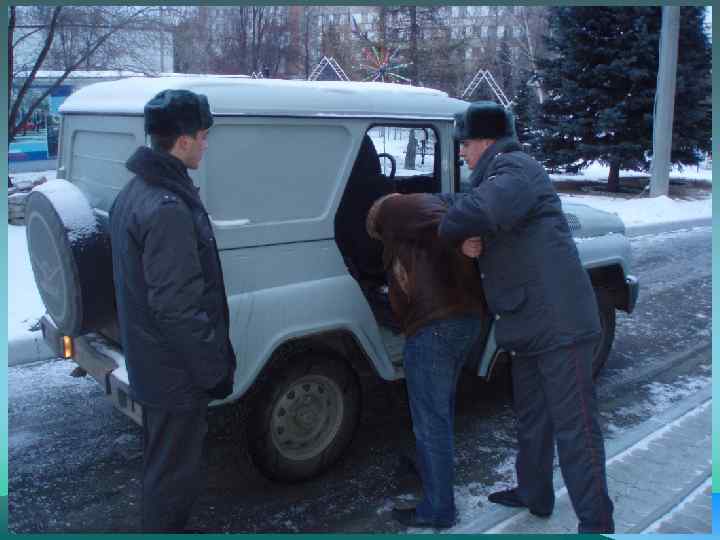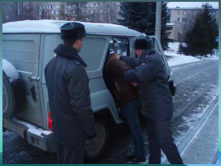 - «прикрой меня» – обращение к напарнику. - «прикрываю» – ответный сигнал напарника. - «двигаюсь» – сообщение напарнику о своём движении вперёд. - «контакт» – сообщение напарнику о задержании неизвестного гражданина. Вопрос 7. ЗАДЕРЖАНИЕ ЛИЦ, СОВЕРШИВШИХ ПРЕСТУПЛЕНИЕ И ПЫТАЮЩИХСЯ СКРЫТЬСЯ НА АВТОМОБИЛЕ 7. 1. Остановка машины с подозреваемыми Для задержания следует выбирать удобное место, обеспечивающее безопасность, как сотрудников полиции, так и посторонних граждан. Задерживать лучше у перекрестков, когда водители остановились на красный сигнал светофора.