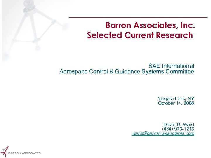 Barron Associates, Inc. Selected Current Research SAE International Aerospace Control & Guidance Systems Committee Niagara Falls, NY October 14, 2008 David G. Ward (434) 973 -1215 ward@barron-associates. com Proprietary