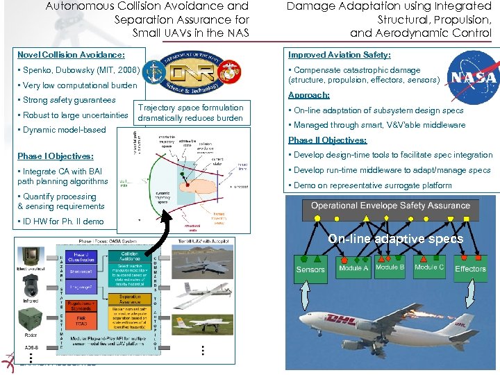Autonomous Collision Avoidance and Separation Assurance for Small UAVs in the NAS Damage Adaptation using Integrated Structural, Propulsion, and Aerodynamic Control Novel Collision Avoidance: Improved Aviation Safety: • Spenko, Dubowsky (MIT, 2006) • Compensate catastrophic damage (structure, propulsion, effectors, sensors) • Very low computational burden • Strong safety guarantees • Robust to large uncertainties • Dynamic model-based Approach: Trajectory space formulation dramatically reduces burden • On-line adaptation of subsystem design specs • Managed through smart, V&V’able middleware Phase II Objectives: Phase I Objectives: • Develop design-time tools to facilitate spec integration • Integrate CA with BAI path planning algorithms • Develop run-time middleware to adapt/manage specs • Demo on representative surrogate platform • Quantify processing & sensing requirements • ID HW for Ph. II demo On-line adaptive specs Proprietary