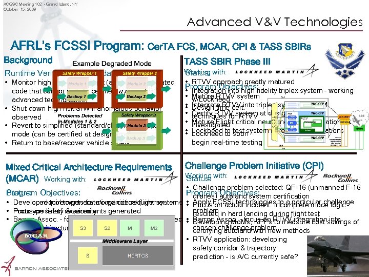 ACGSC Meeting 102 – Grand Island, NY October 15, 2008 Advanced V&V Technologies AFRL’s FCSSI Program: Cer. TA FCS, MCAR, CPI & TASS SBIRs Background TASS SBIR Phase III Runtime Verification & Validation (RTVV) Working with: Status: • RTVV approach greatly matured Program Objectives: • Integration into high fidelity triplex system – working • Mature RTVV system w/Lockheed • Integrate RTVV into triplex system with RM • Design time cert. • Certify RTVV system at design time techniques for RTVV • Mature Flight critical neural network verification tool investigated • Lockheed to test system in real-time simulations • Lockheed to soon begin real-time testing • Monitor high risk S/W in flight (algorithm/associated code that cannot be fully certified a priori due to advanced technologies) • Shut down high risk S/W if anomalous behavior observed • Revert to simplified (standard/classical) backup mode (can be certified at design time) • Return to base/recover vehicle safely Mixed Critical Architecture Requirements (MCAR) Working with: Challenge Problem Initiative (CPI) Working with: Status: • Challenge problem selected: QF-16 (unmanned F-16 Program autoland system certification drones) Objectives: • Develop requirements for mixed critical flight systems • Apply FCSSI technologies to a particular challenge Developed tool to generate/organize requirements • Focus on actual incident: incomplete mode logic problem in hard landing during flight test • Focus on safety requirements generated Prototype list of & security resulted • Barron Assoc. – focus on RTVV integration into mixed • Barron Assoc. – focus on RTVV integrationsavings of • Developing Mo. Ms, KPPs to measure cost into chosen challenge problem methods critical architectures certifying autoland with new • RTVV application: developing safety corridor & trajectory prediction – is A/C currently safe? Program Objectives: Status: Proprietary