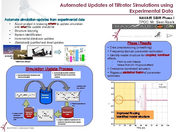 Automated Updates of Tiltrotor Simulations using Experimental Data NAVAIR SBIR Phase I TPOC: Mr. Sean Roark Automate simulation-updates from experimental data • • • Assist analyst in knowing where to update simulation and what the update should be Structure learning System Identification Incremental database updates Statistically justified and local updates Phase I Results • Data preprocessing (smoothing) • Frequency domain parameter estimation • Identify model structure for coupled, nonlinear effects aeronautics. arc. nasa. gov - halfdome. arc. nasa. gov Simulation Update Process • Overcome correlated actuators • Rigorous statistical fusion of parameter estimates 1. automatically determine nonlinear regression structure at a particular condition 5. automatically update simulation data based upon analysis Pitch Up with Sideslip Heave-Roll (XV-15 ground effect) nonlinear terms (e. g. , splines) C M C ( a , Mach , . . . ) = z i i Simulation M = C M +. . . + C 0 . . . + C Data Tables M a 1 a + Ma - 40 ) 2 ] + [( a 2. Perform regression on data 4. convert to form suitable for simulation data table Proprietary Convert to aero table format = Ma 1 ± N (0 , s C m M a 1 M ) Experimental Flight Data a 1 3. compute confidence measures for the parameters that will be used to update the database Improved fit using identified model structure