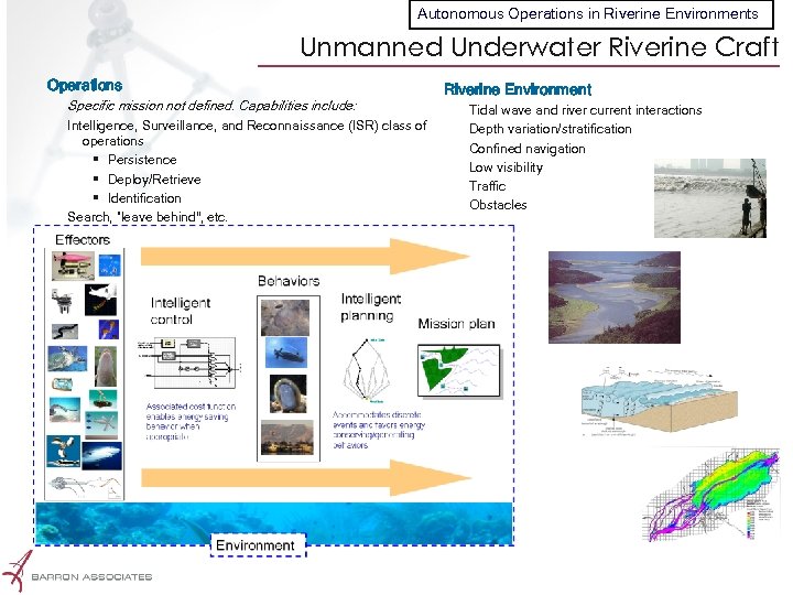 Autonomous Operations in Riverine Environments Unmanned Underwater Riverine Craft Operations Specific mission not defined. Capabilities include: Intelligence, Surveillance, and Reconnaissance (ISR) class of operations § Persistence § Deploy/Retrieve § Identification Search, “leave behind”, etc. Proprietary Riverine Environment Tidal wave and river current interactions Depth variation/stratification Confined navigation Low visibility Traffic Obstacles