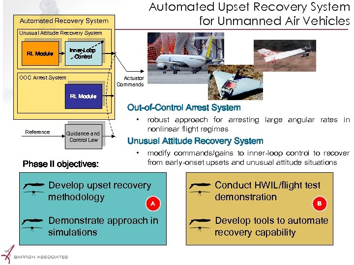 Automated Upset Recovery System for Unmanned Air Vehicles Automated Recovery System Unusual Attitude Recovery System Inner-Loop Control RL Module OOC Arrest System Actuator Commands RL Module Out-of-Control Arrest System • Reference Guidance and Control Law Unusual Attitude Recovery System • Phase II objectives: robust approach for arresting large angular rates in nonlinear flight regimes modify commands/gains to inner-loop control to recover from early-onset upsets and unusual attitude situations Develop upset recovery methodology Conduct HWIL/flight test demonstration Demonstrate approach in simulations Develop tools to automate recovery capability A Proprietary B
