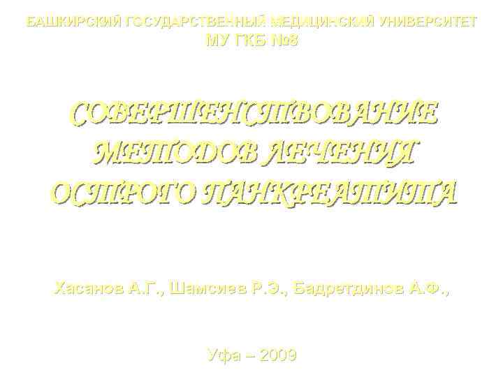 БАШКИРСКИЙ ГОСУДАРСТВЕННЫЙ МЕДИЦИНСКИЙ УНИВЕРСИТЕТ МУ ГКБ № 8 СОВЕРШЕНСТВОВАНИЕ МЕТОДОВ ЛЕЧЕНИЯ ОСТРОГО ПАНКРЕАТИТА Хасанов А. Г. , Шамсиев Р. Э. , Бадретдинов А. Ф. , Уфа – 2009 1