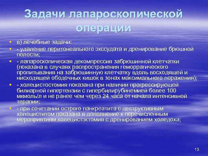 Задачи лапароскопической операции § в) лечебные задачи: § - удаление перитонеального экссудата и дренирование брюшной полости; § - лапароскопическая декомпрессия забрюшинной клетчатки (показана в случаях распространения геморрагического пропитывания на забрюшинную клетчатку вдоль восходящей и нисходящей ободочных кишок в зонах максимального поражения); § - холецистостомия показана при наличии прогрессирующей билиарной гипертензии с гипербилирубинемией более 100 мкмоль/л и не ранее чем через 24 часа от начала интенсивной терапии; § - при сочетании острого панкреатита с деструктивным холециститом показана в дополнение к перечисленным мероприятиям холецистэктомия с дренированием холедоха; 13