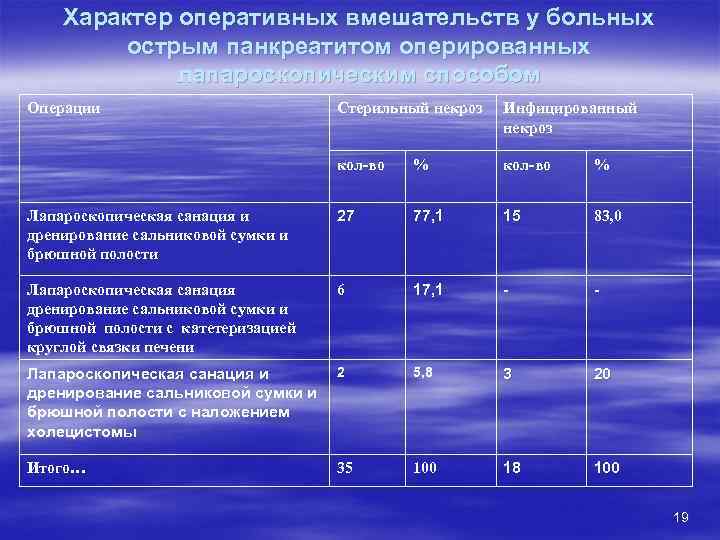 Характер оперативных вмешательств у больных острым панкреатитом оперированных лапароскопическим способом Операции Стерильный некроз Инфицированный некроз кол-во % Лапароскопическая санация и 27 77, 1 15 83, 0 дренирование сальниковой сумки и брюшной полости Лапароскопическая санация 6 17, 1 - - дренирование сальниковой сумки и брюшной полости с катетеризацией круглой связки печени Лапароскопическая санация и 2 5, 8 3 20 дренирование сальниковой сумки и брюшной полости с наложением холецистомы Итого… 35 100 18 100 19