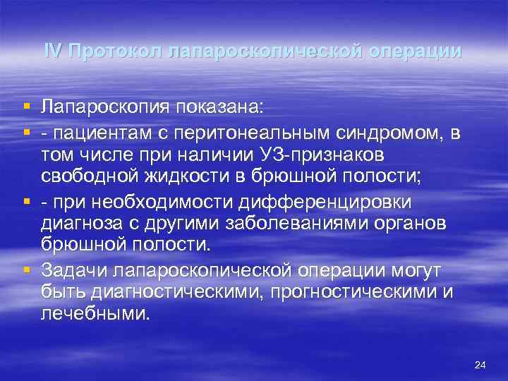 IV Протокол лапароскопической операции § Лапароскопия показана: § - пациентам с перитонеальным синдромом, в том числе при наличии УЗ-признаков свободной жидкости в брюшной полости; § - при необходимости дифференцировки диагноза с другими заболеваниями органов брюшной полости. § Задачи лапароскопической операции могут быть диагностическими, прогностическими и лечебными. 24