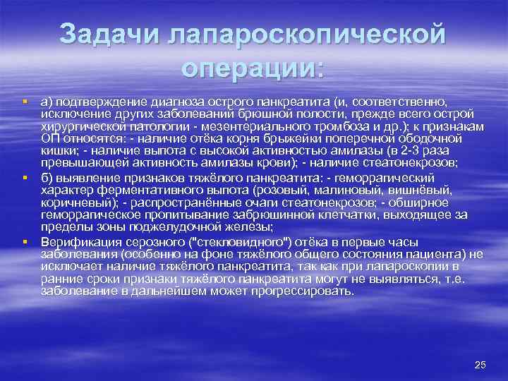 Задачи лапароскопической операции: § а) подтверждение диагноза острого панкреатита (и, соответственно, исключение других заболеваний брюшной полости, прежде всего острой хирургической патологии - мезентериального тромбоза и др. ); к признакам ОП относятся: - наличие отёка корня брыжейки поперечной ободочной кишки; - наличие выпота с высокой активностью амилазы (в 2 -3 раза превышающей активность амилазы крови); - наличие стеатонекрозов; § б) выявление признаков тяжёлого панкреатита: - геморрагический характер ферментативного выпота (розовый, малиновый, вишнёвый, коричневый); - распространённые очаги стеатонекрозов; - обширное геморрагическое пропитывание забрюшинной клетчатки, выходящее за пределы зоны поджелудочной железы; § Верификация серозного ("стекловидного") отёка в первые часы заболевания (особенно на фоне тяжёлого общего состояния пациента) не исключает наличие тяжёлого панкреатита, так как при лапароскопии в ранние сроки признаки тяжёлого панкреатита могут не выявляться, т. е. заболевание в дальнейшем может прогрессировать. 25