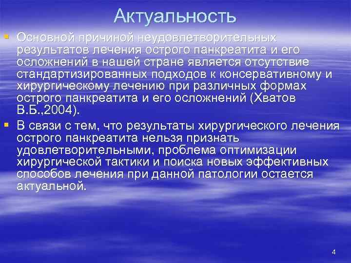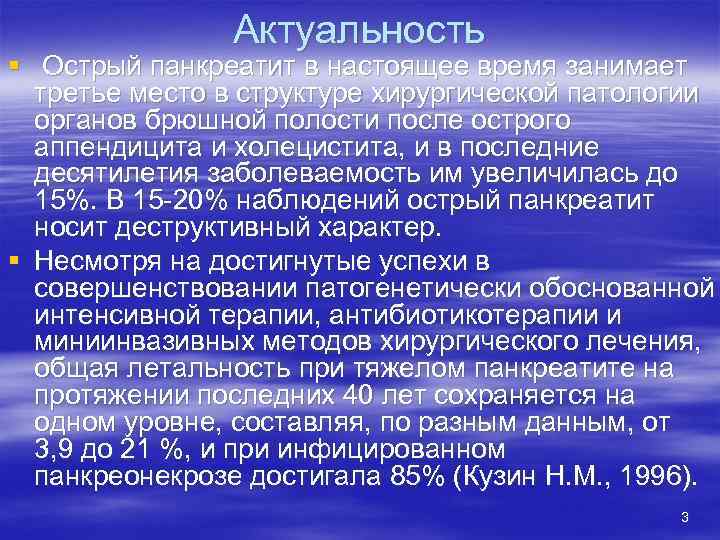Актуальность § Острый панкреатит в настоящее время занимает третье место в структуре хирургической патологии органов брюшной полости после острого аппендицита и холецистита, и в последние десятилетия заболеваемость им увеличилась до 15%. В 15 -20% наблюдений острый панкреатит носит деструктивный характер. § Несмотря на достигнутые успехи в совершенствовании патогенетически обоснованной интенсивной терапии, антибиотикотерапии и миниинвазивных методов хирургического лечения, общая летальность при тяжелом панкреатите на протяжении последних 40 лет сохраняется на одном уровне, составляя, по разным данным, от 3, 9 до 21 %, и при инфицированном панкреонекрозе достигала 85% (Кузин Н. М. , 1996). 3