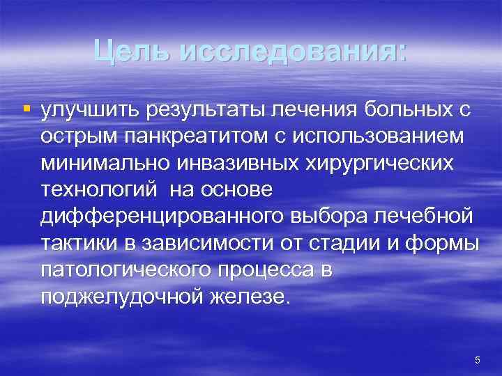 Актуальность § Основной причиной неудовлетворительных результатов лечения острого панкреатита и его осложнений в нашей стране является отсутствие стандартизированных подходов к консервативному и хирургическому лечению при различных формах острого панкреатита и его осложнений (Хватов В. Б. , 2004). § В связи с тем, что результаты хирургического лечения острого панкреатита нельзя признать удовлетворительными, проблема оптимизации хирургической тактики и поиска новых эффективных способов лечения при данной патологии остается актуальной. 4