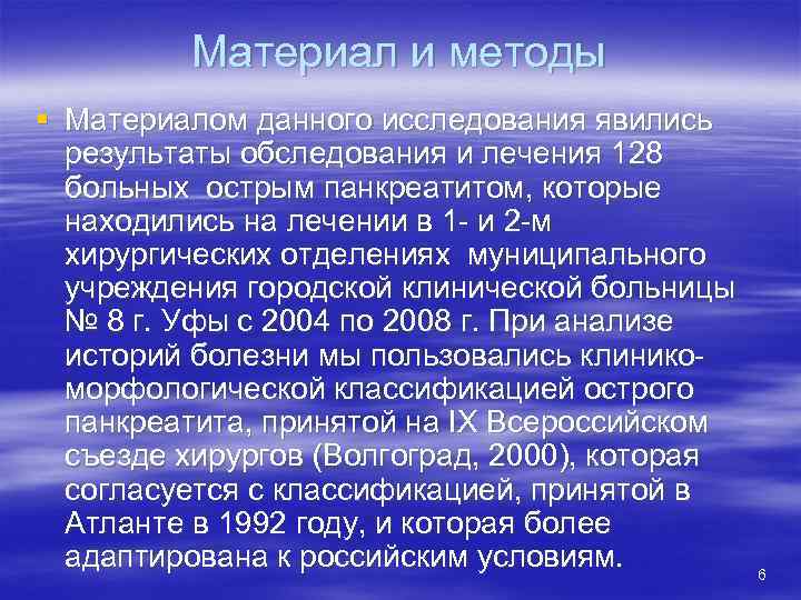 Материал и методы § Материалом данного исследования явились результаты обследования и лечения 128 больных острым панкреатитом, которые находились на лечении в 1 - и 2 -м хирургических отделениях муниципального учреждения городской клинической больницы № 8 г. Уфы с 2004 по 2008 г. При анализе историй болезни мы пользовались клинико- морфологической классификацией острого панкреатита, принятой на IX Всероссийском съезде хирургов (Волгоград, 2000), которая согласуется с классификацией, принятой в Атланте в 1992 году, и которая более адаптирована к российским условиям. 6