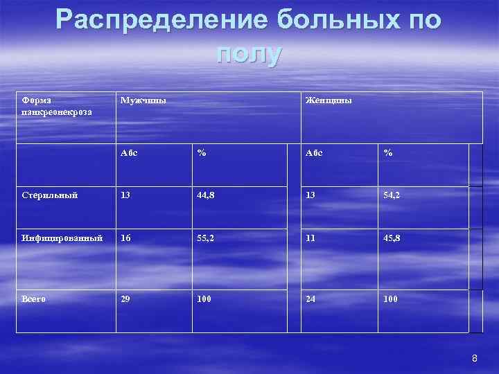 Распределение больных по полу Форма Мужчины Женщины панкреонекроза Абс % Стерильный 13 44, 8 13 54, 2 Инфицированный 16 55, 2 11 45, 8 Всего 29 100 24 100 8