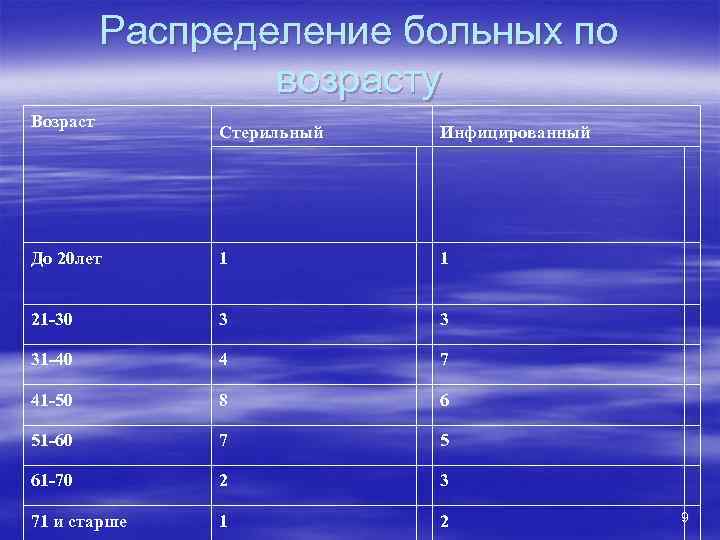 Распределение больных по возрасту Возраст Стерильный Инфицированный До 20 лет 1 1 21 -30 3 3 31 -40 4 7 41 -50 8 6 51 -60 7 5 61 -70 2 3 71 и старше 1 2 9