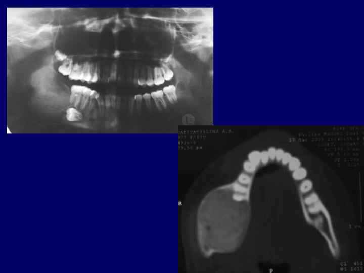 Фолликулярная киста. Данное патологическое образование возникает вследствие порока развития зубообразовательного эпителия. Стенка кисты состоит из соединительнотканной оболочки, выстланной плоским эпителием. Полость содержит светлую жидкость с кристаллами холестерина. В кистозной полости могут обнаруживаться зачатки зубов. Первым клиническим проявлением кисты обычно бывает деформация - утолщение челюсти в каком -либо отделе. Первым признаком, свидетельствующим о наличии кисты может быть и задержка прорезывания какого-либо зуба. Для уточнения диагноза используют рентгенографию и пункцию кисты. При пункции получают светлую янтарную опалесцирующую жидкость. На рентгенограммах фолликулярная киста представлена зоной разрежения в виде полости с четкими краями. В полости всегда проецируется зачаток зуба, связанный со стенкой кисты. Граница кисты всегда четкая в виде склеротического контура. Лечение. Фолликулярные кисты подлежат полному удалению.