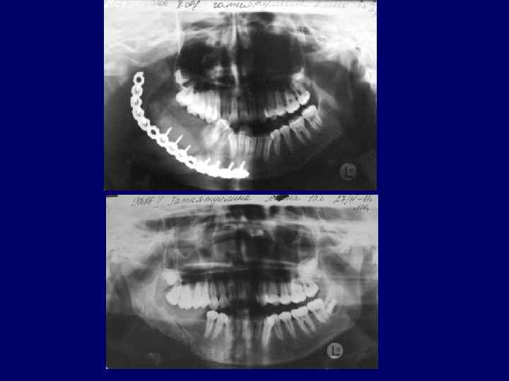 Пациентка 11 лет, диагноз: Фиброзная остеодисплазия подбородочного отдела нижней челюсти, ортопантомография Состояние после операции - биопсии