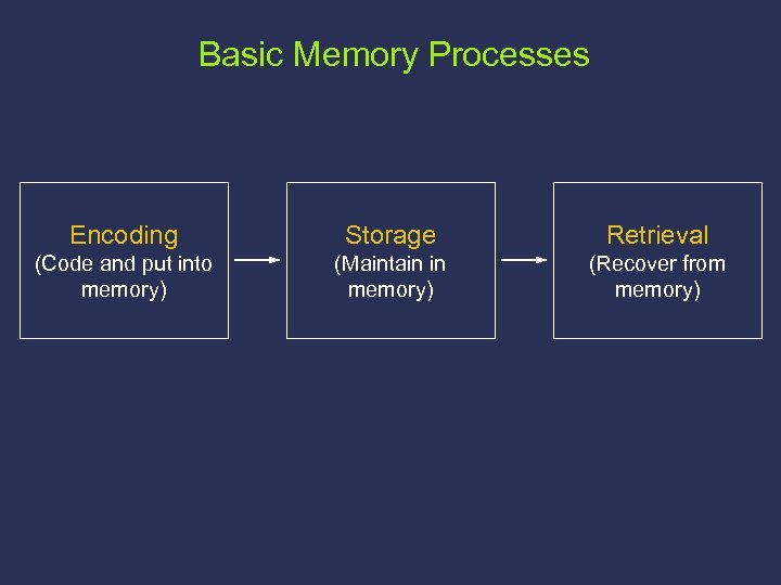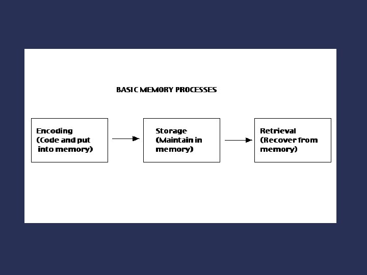 Basic Memory Processes Encoding Storage Retrieval (Code and put into memory) (Maintain in memory) (Recover from memory)