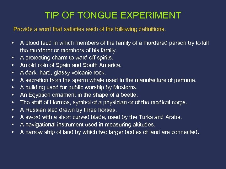 TIP OF TONGUE EXPERIMENT Provide a word that satisfies each of the following definitions. • • • A blood feud in which members of the family of a murdered person try to kill the murderer or members of his family. A protecting charm to ward off spirits. An old coin of Spain and South America. A dark, hard, glassy volcanic rock. A secretion from the sperm whale used in the manufacture of perfume. A building used for public worship by Moslems. An Egyption ornament in the shape of a beetle. The staff of Hermes, symbol of a physician or of the medical corps. A Russian sled drawn by three horses. A sword with a short curved blade, used by the Turks and Arabs. A navigational instrument used in measuring altitudes. A narrow strip of land by which two larger bodies of land are connected.