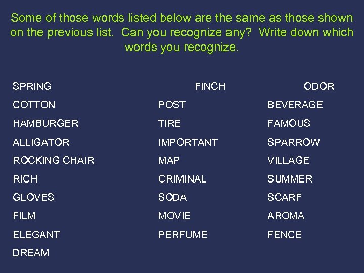 Some of those words listed below are the same as those shown on the previous list. Can you recognize any? Write down which words you recognize. SPRING FINCH ODOR COTTON POST BEVERAGE HAMBURGER TIRE FAMOUS ALLIGATOR IMPORTANT SPARROW ROCKING CHAIR MAP VILLAGE RICH CRIMINAL SUMMER GLOVES SODA SCARF FILM MOVIE AROMA ELEGANT PERFUME FENCE DREAM