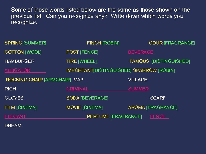Some of those words listed below are the same as those shown on the previous list. Can you recognize any? Write down which words you recognize. SPRING [SUMMER] FINCH [ROBIN] ODOR [FRAGRANCE] COTTON [WOOL] POST [FENCE] BEVERAGE HAMBURGER TIRE [WHEEL] FAMOUS [DISTINGUISHED] ALLIGATOR IMPORTANT[DISTINGUISHED] SPARROW [ROBIN] ROCKING CHAIR [ARMCHAIR] MAP VILLAGE RICH CRIMINAL SUMMER GLOVES SODA [BEVERAGE] FILM [CINEMA] MOVIE [CINEMA] ELEGANT DREAM SCARF AROMA [FRAGRANCE] PERFUME [FRAGRANCE] FENCE