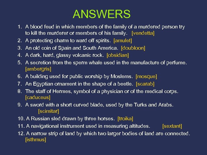 ANSWERS 1. A blood feud in which members of the family of a murdered person try to kill the murderer or members of his family. [vendetta] 2. A protecting charm to ward off spirits. [amulet] 3. An old coin of Spain and South America. [doubloon] 4. A dark, hard, glassy volcanic rock. [obsidian] 5. A secretion from the sperm whale used in the manufacture of perfume. [ambergris] 6. A building used for public worship by Moslems. [mosque] 7. An Egyptian ornament in the shape of a beetle. [scarab] 8. The staff of Hermes, symbol of a physician or of the medical corps. [caduceus] 9. A sword with a short curved blade, used by the Turks and Arabs. [scimitar] 10. A Russian sled drawn by three horses. [troika] 11. A navigational instrument used in measuring altitudes. [sextant] 12. A narrow strip of land by which two larger bodies of land are connected. [isthmus]