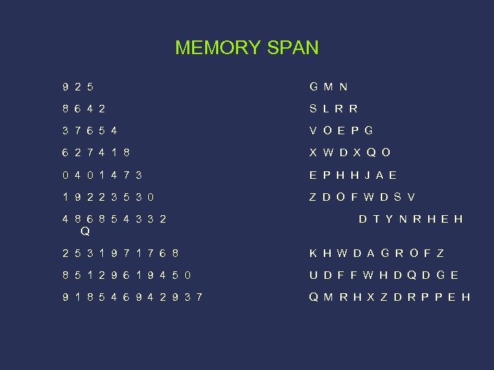 MEMORY SPAN 9 2 5 G M N 8 6 4 2 S L R R 3 7 6 5 4 V O E P G 6 2 7 4 1 8 X W D X Q O 0 4 0 1 4 7 3 E P H H J A E 1 9 2 2 3 5 3 0 Z D O F W D S V 4 8 6 8 5 4 3 3 2 Q D T Y N R H E H 2 5 3 1 9 7 1 7 6 8 K H W D A G R O F Z 8 5 1 2 9 6 1 9 4 5 0 U D F F W H D Q D G E 9 1 8 5 4 6 9 4 2 9 3 7 Q M R H X Z D R P P E H