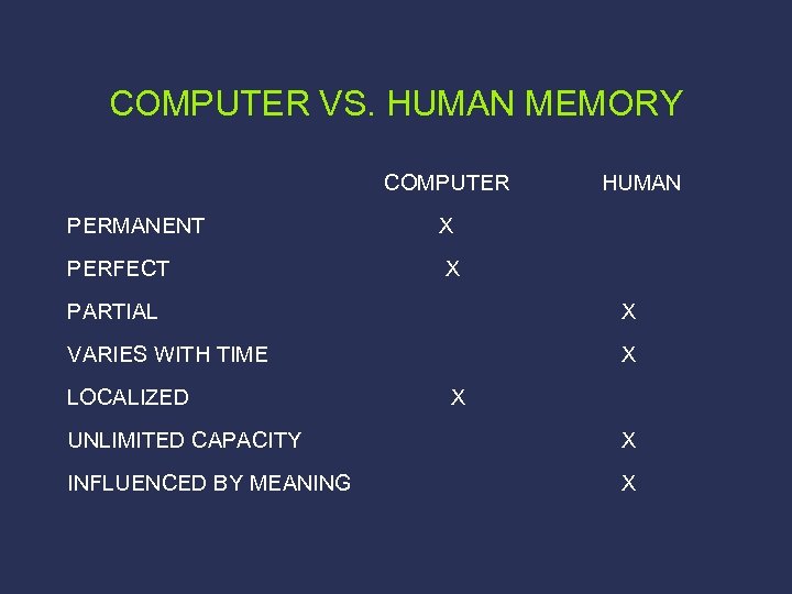 COMPUTER VS. HUMAN MEMORY COMPUTER PERMANENT X PERFECT HUMAN X PARTIAL X VARIES WITH TIME X LOCALIZED X UNLIMITED CAPACITY X INFLUENCED BY MEANING X