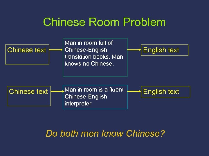 Chinese Room Problem Chinese text Man in room full of Chinese-English translation books. Man knows no Chinese. Man in room is a fluent Chinese-English interpreter English text Do both men know Chinese?