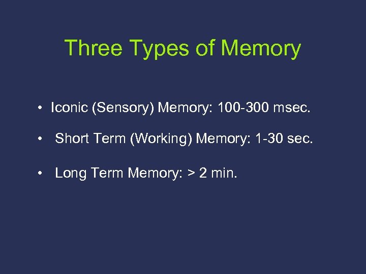 Three Types of Memory • Iconic (Sensory) Memory: 100 -300 msec. • Short Term (Working) Memory: 1 -30 sec. • Long Term Memory: > 2 min.