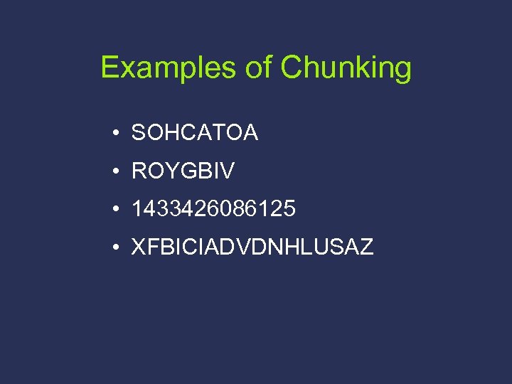 Examples of Chunking • SOHCATOA • ROYGBIV • 1433426086125 • XFBICIADVDNHLUSAZ