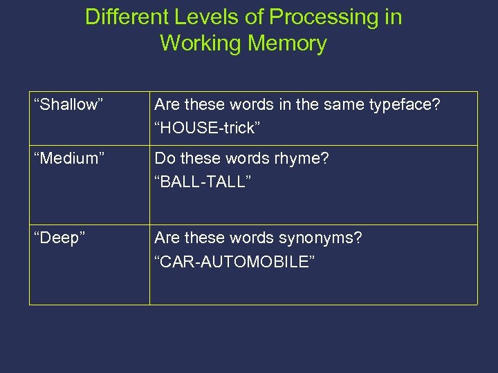 Different Levels of Processing in Working Memory “Shallow” Are these words in the same typeface? “HOUSE-trick” “Medium” Do these words rhyme? “BALL-TALL” “Deep” Are these words synonyms? “CAR-AUTOMOBILE”