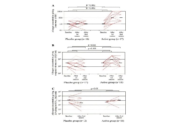 Conclusion • SCIT with grass pollens leads to significant improvement of rhinitis- and asthma symptoms in children. • In comparison to placebo skin test, conjunctival and bronchial reactivity decreased.