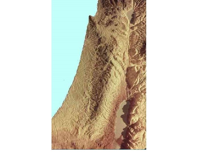 Major Geographic Regions • Several mountain ranges run the length of the country. In the northeast, the basalt landscapes of the Golan Heights, formed by volcanic eruptions in the distant past, rise as steep cliffs overlooking the Hula Valley. The hills of Galilee, ascend to heights ranging from 1, 600 to 4, 000 feet above sea level. • The Jezreel Valley, separating the hills of Galilee from those of Samaria, is Israel's richest agricultural area. The rolling hills of Samaria and Judea present a mosaic of rocky hilltops and fertile valleys, dotted with groves of ageold, silver-green olive trees. The terraced hillsides, first developed by farmers in ancient times, blend into the natural landscape.