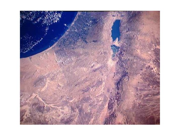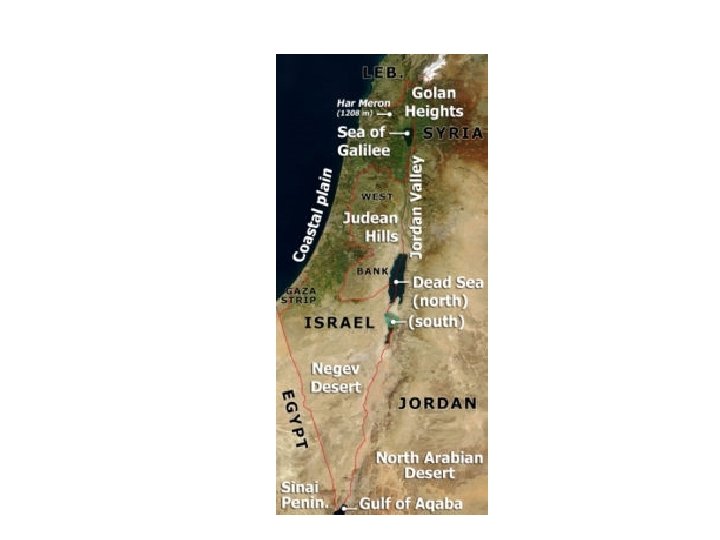 • • • Location: Middle East, bordering the Mediterranean Sea, between Egypt and Lebanon Geographic coordinates: 31 30 N, 34 45 E Map references: Middle East Area: total: 20, 770 sq km land: 20, 330 sq km water: 440 sq km Area - comparative: slightly smaller than New Jersey Land boundaries: total: 1, 006 km border countries: Egypt 255 km, Gaza Strip 51 km, Jordan 238 km, Lebanon 79 km, Syria 76 km, West Bank 307 km Climate: temperate; hot and dry in southern and eastern desert areas Terrain: Negev desert in the south; low coastal plain; central mountains; Jordan Rift Valley Elevation extremes: lowest point: Dead Sea -408 m highest point: Har Meron 1, 208 m
