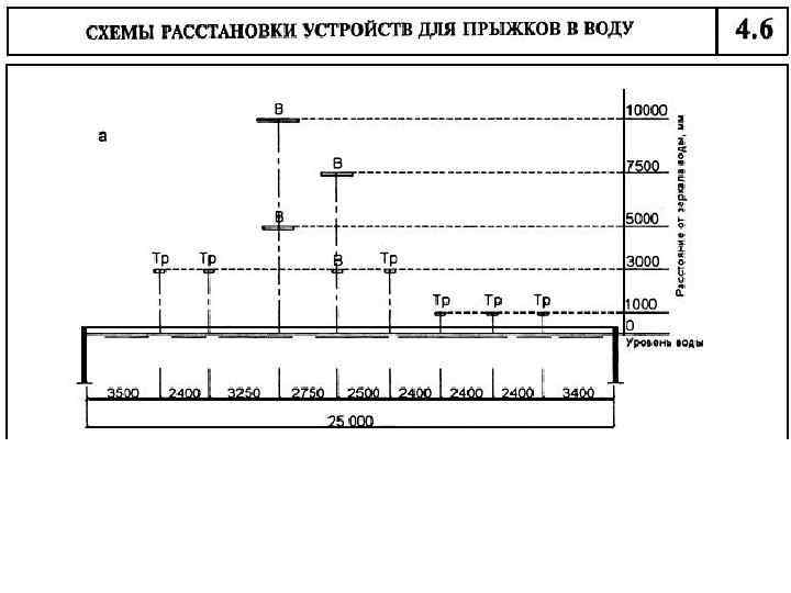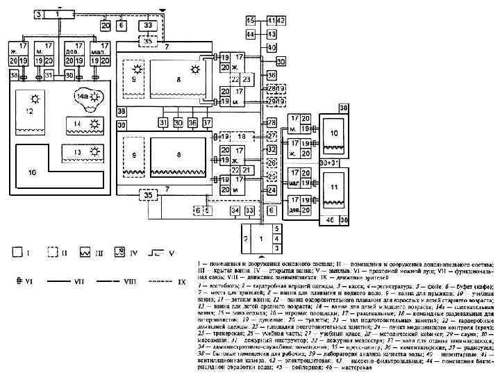 6. Универсальные учебно-тренировочные бассейны, оборудованные для плавания, водного поло, прыжков в воду и предназначенные для обучения плаванию, оздоровительных занятий, тренировок, а также для проведения соревнований местного значения без зрителей или в присутствии ограниченного числа зрителей (до 600 мест в крытых и до 1200 мест в открытых сооружениях) 7. универсальные демонстрационные бассейны, рассчитанные на проведение крупных соревнований с числом мест более 600 в крытых и 1200 мест в открытых бассейнах.