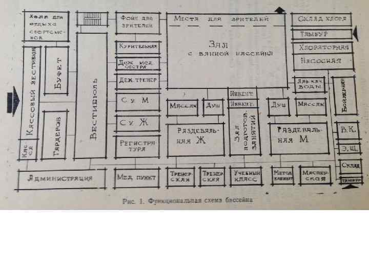Функционально сооружение бассейна объединяет одну или несколько ванн, помещения и устройства для обслуживания занимающихся, зрителей (преимущественно в универсальных и демонстрационных бассейнах), а также помещения с устройствами, обеспечивающими его техническую эксплуатацию